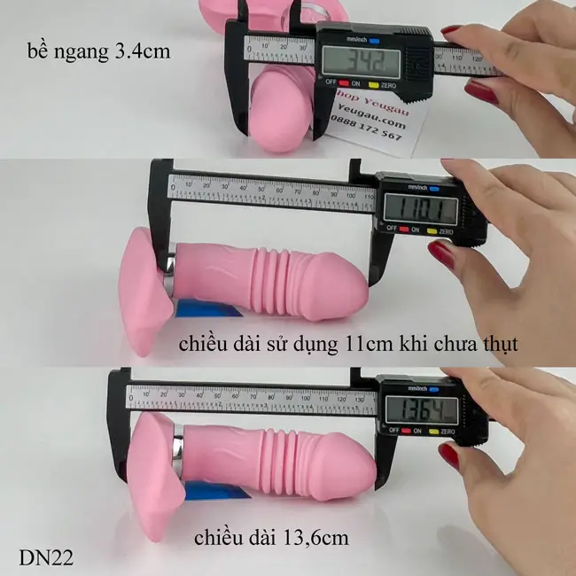 Cu giả rung thụt này có size phù hợp với cơ thể người phụ nữ Việt Nam. Sextoy có chiều dài 11cm (khi thụt tăng được 2-3cm), bề ngang 3,4cm.